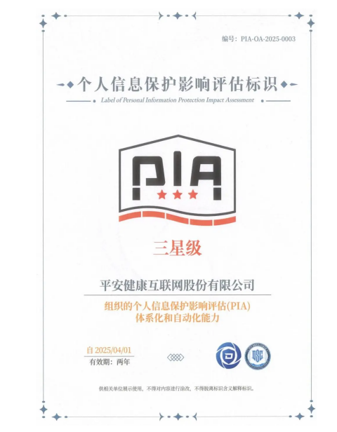 此次PIA“三星级”认证由中国信通院联合行业权威机构颁发,是对平安健康在个人信息保护领域制度构建、技术能力以及持续管理能力的高度认可,标志着其已达到国内领先水平。这一认证不仅验证了平安健康在个人信息保护方面的体系化能力,更为其业务服务和创新提供了坚实的安全保障。