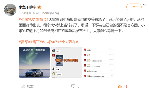 不少网友误以为小米YU7将在5月22日上市,还有不少大V转发了这份海报。对此,博主@ 小鱼干聊车发文称,大家看到的海报是我们群友等着急了,开玩笑做了玩的,从群里面流传出去,很多大V都上当转发了,辟谣一下群友自己做的图不是官方图,小米YU7这个月22号会亮相在玄戒新品发布会上,大家耐心等待一下。