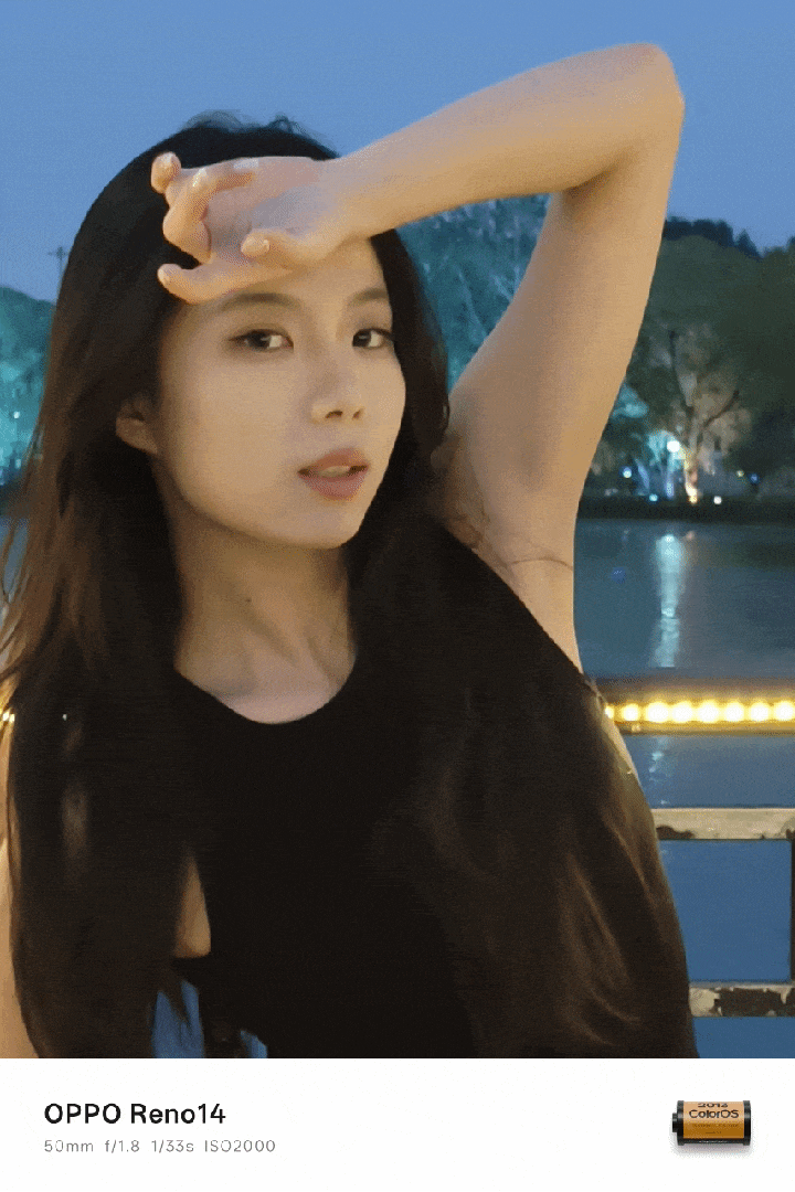OPPO Reno14也能通过爆闪模式赋予人像风格化的视觉效果。在此基础上,Reno14系列带来了闪光实况照片功能,画面中的人物肤色呈现自然真实,没有过度渲染,明暗对比间面部轮廓清晰分明,展现出恰到好处的立体感,画面整体通透干净,没有暗光拍摄常有的噪点与模糊,营造出不失生动的氛围感。