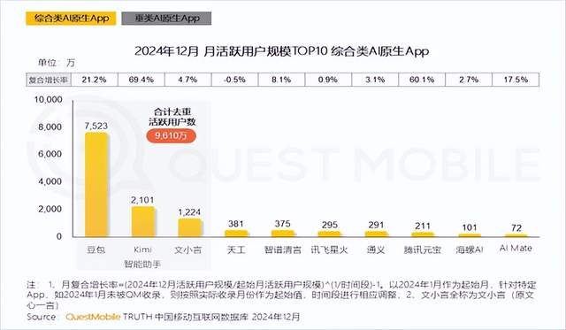 QuestMobile数据显示,截至2024年12月,Kimi全平台月活跃用户达2101万,全年复合增长率69.4%,稳居国内AI应用次席,与豆包、文小言并称“AI原生三强”。