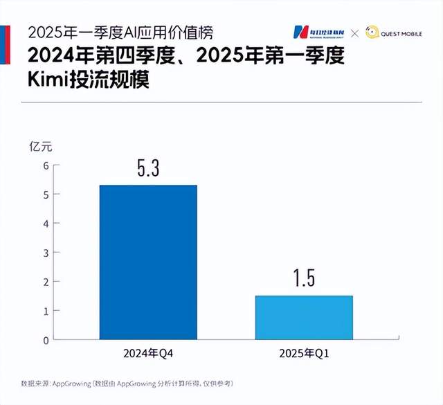 同时,据App Growing统计,Kimi在2025年第一季度的广告投入已缩减至1.5亿元,较去年第四季度的5.3亿元骤降72%。对于这一投流刹车举动,月之暗面内部解释为受到“外部因素和内部战略调整影响”。