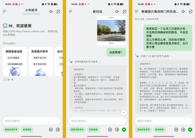 AI性能表现方面,这次的小布接入了DeepSeek深度思考,AI性能更为强大,不论是识图能力,还是文生图、生成旅游攻略等,都非常便捷。