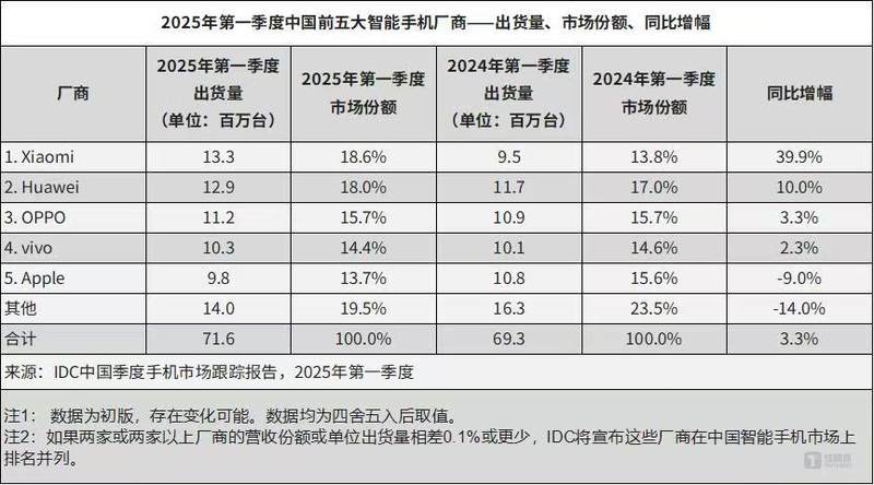 根据IDC最新发布的报告,2025 年第一季度中国智能手机市场出货量为7160万部,同比增长3.3%,优于全球1.5%的增长。