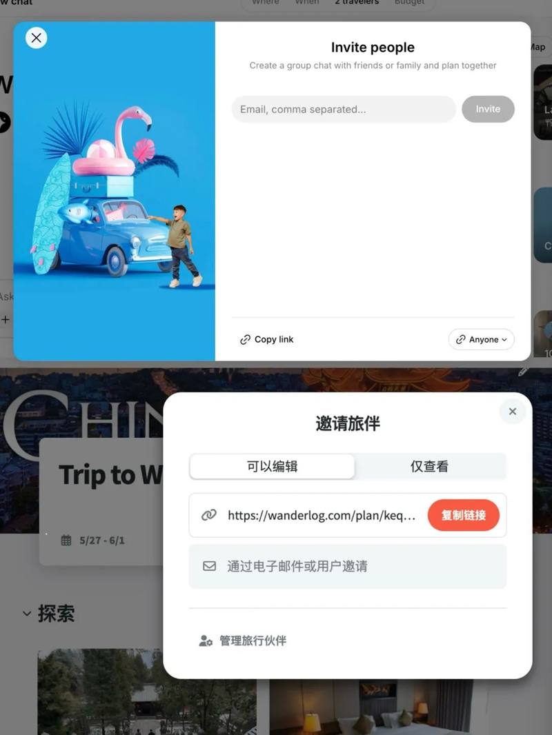 另一方面,如wanderlog、Mindtrip也提供了旅伴管理(甚至精细到宠物)功能,你可以将行程分享给同伴,一同规划旅行。