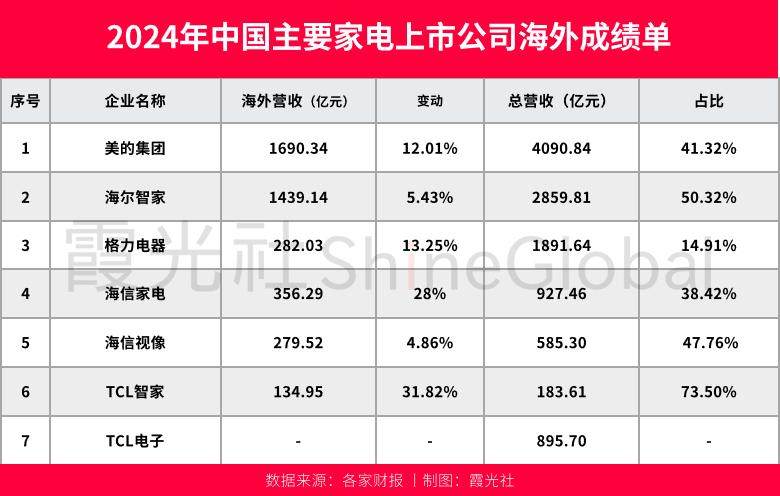 从2024年财报来看,五大家电巨头除了格力(格力2024全年营收1900亿,同比下滑7.31%),其余四家均实现了营收增长,其中美的、海信、TCL三家增长均超过7%。
