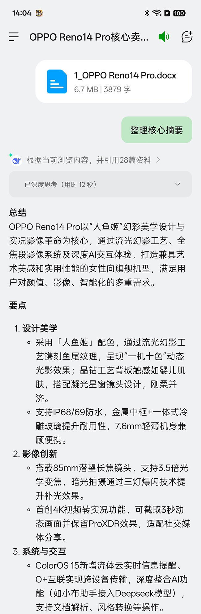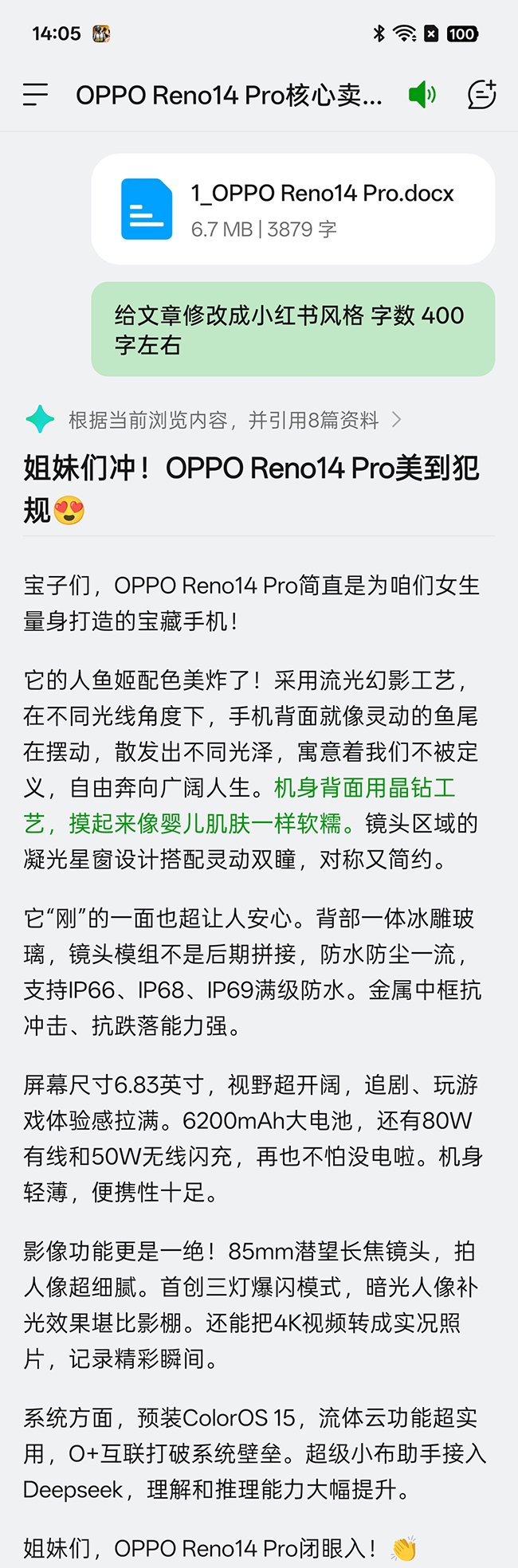 之前ColorOS 15通过系统级AI的全面深度赋能,已经给我们带来了非常智慧便捷的体验,像是一键问屏、AI文档、AI便签、AI修图、AI语音摘要等功能都非常广受好评,想必不少人也用过这些功能,而这次OPPO Reno14系列上,AI最主要的升级点当数全面接入了Deepseek,理解能力和推理能力得到了大幅提升,让整台手机变得更加聪明。