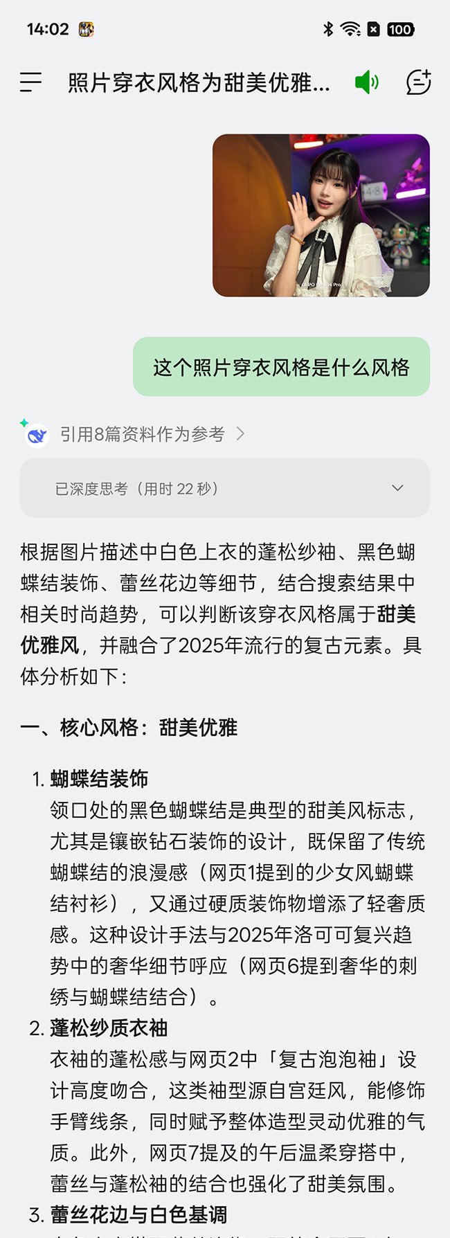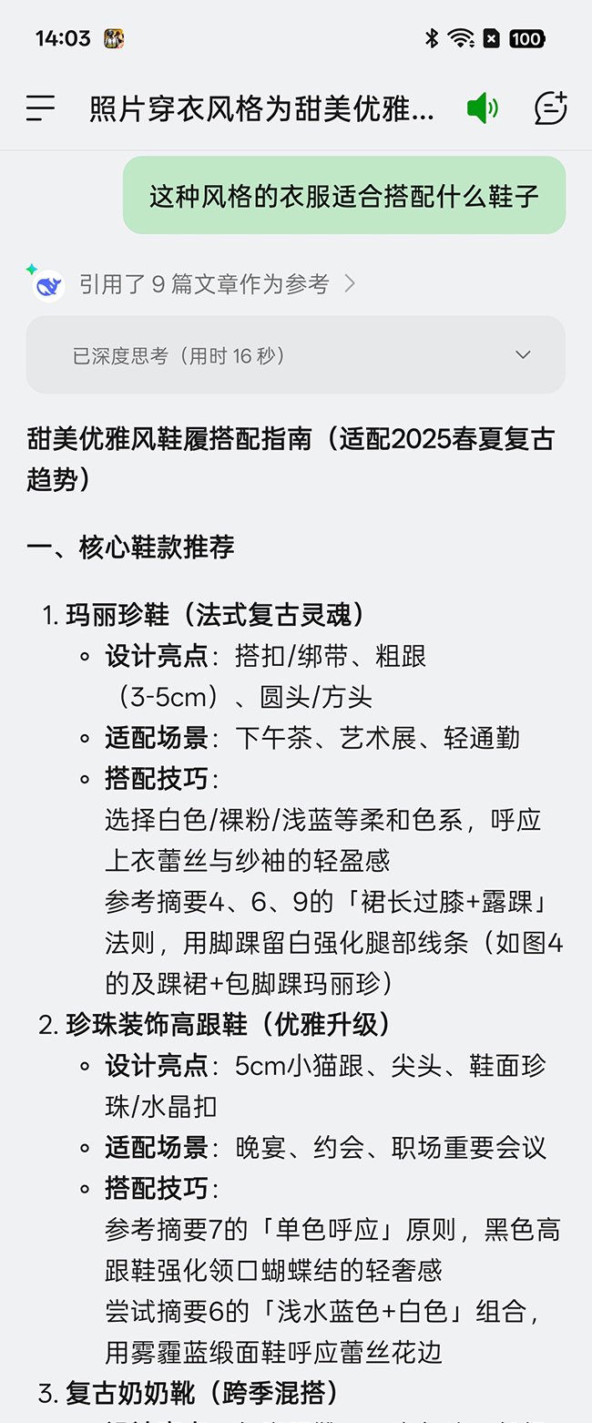 另外,Deepseek还能够看得懂图片、看得懂的文档。我向它上传了一张人像照片,但是我并不知道具体是什么穿衣风格,而OPPO Reno14系列通过衣服上的各类元素进行深度分析,告诉我这是甜美优雅风,并且还能针对内容继续延伸,它还告诉我这类衣服适合搭配什么样的鞋子。