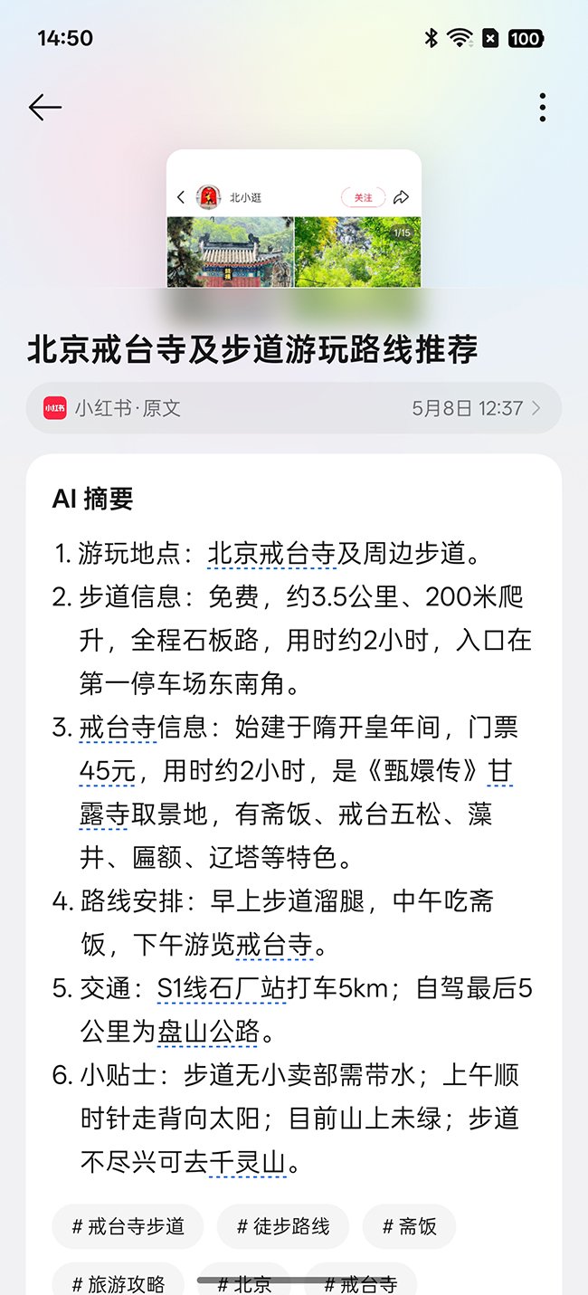 小布记忆算是当下业界独有的一个功能,我用三指轻轻上划屏幕,AI就能快速识别、分析、并记录保存在屏幕中旅行攻略、美食种草、穿搭指南等各类信息,可以说是收藏碎片化信息的一个好工具。