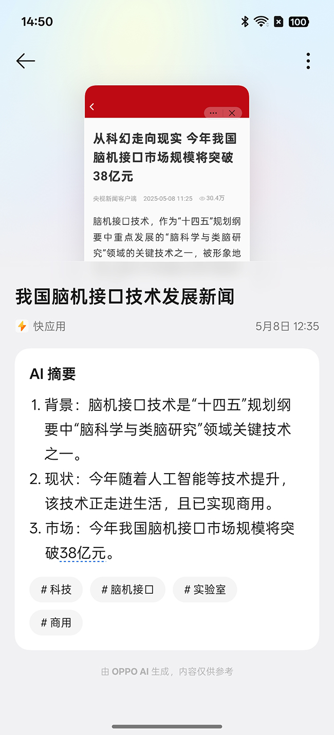 OPPO Reno14系列的超级小布助手真正让AI成了生活全能帮手!深度接入Deepseek大模型后,它不仅能像学者一样解答专业问题、像造型师解读穿搭风格,还能化身文案高手改写文档风格,甚至用三指上划一键收藏碎片信息。从烧脑知识到生活技巧,从文字处理到图像理解,这部手机正用更聪明、更人性化的AI体验,重新定义智能工具——让每个人都能感受到手机比你更懂你的AI效率革命。