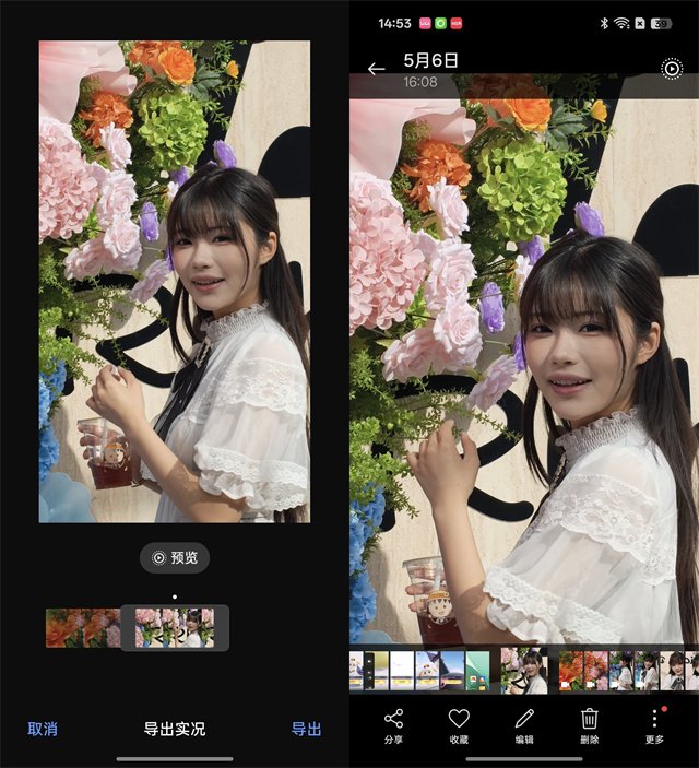 在短视频与图文交织的社交时代,Reno14系列解决了实况内容分享的核心痛点。通过小红书HDR Live直出功能,动态照片的色彩与光影得以无损呈现。若想从3秒实况中提取最满意的单帧,用户可直接导出多达90张高清静态照片,每张均保留ProXDR效果。这种“一动多静”的创作模式,既满足短视频平台的动态展示需求,又适配朋友圈九宫格的静态美学,真正实现“一次拍摄,全场景覆盖”。
