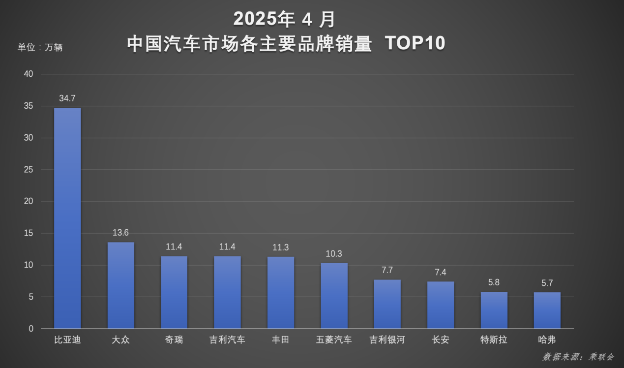 作为季度承上启下的关键节点,4月比亚迪汽车再次以34.7万辆的成绩,位列中国汽车市场各主要品牌销量TOP10第一,几乎等同于第二至四名之和;比亚迪汽车1-4月累计销量超128万辆,同比增幅显著,呈现出强劲的增长动力与市场统治力,展现头部品牌势能。