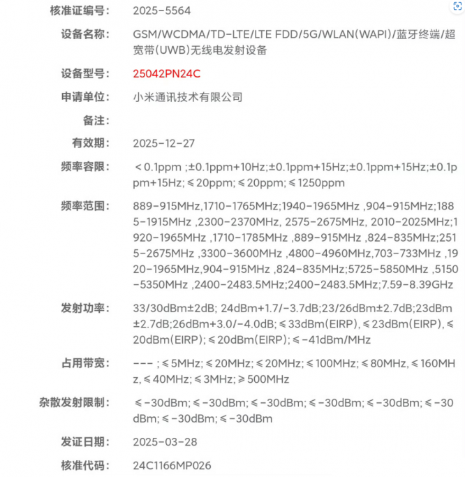 早在今年就有消息称,小米旗下的一款新机已通过国家质量认证,型号为 25042PN24C,支持 90W 快充,并且支持超宽带(UWB)无线电发射,