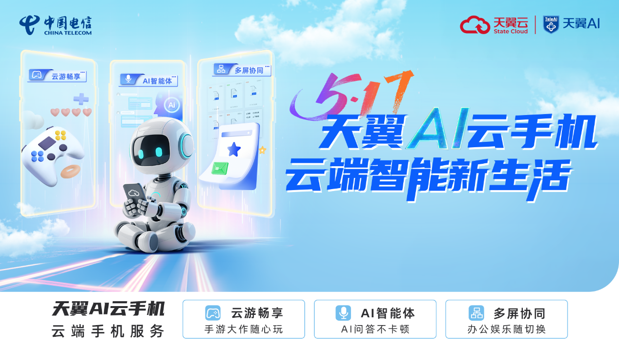 人工智能时代,云与AI技术深度融合,重塑现有产品,催生全新业务形态。中国电信充分发挥云网融合、国云智算底座、云原生及应用生态合作等优势,重塑天翼AI云手机,并于5月17日重磅发布,为用户打造更智能、更便捷、更丝滑的智能终端体验。