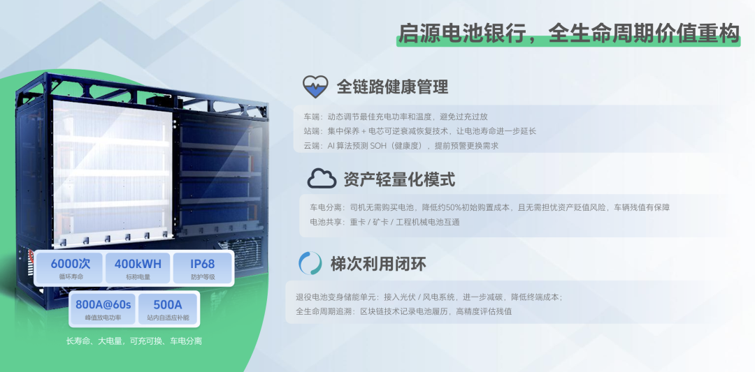 运营着全国最大的商用车电池银行,启源芯动力以“车电分离” 模式破解用户痛点,降低司机初始购车投入与对电池贬值的担忧、提供约3分钟的快速换电服务;通过自研长寿命电池系统与“风光储充换”一体化运作,降低终端用能成本……