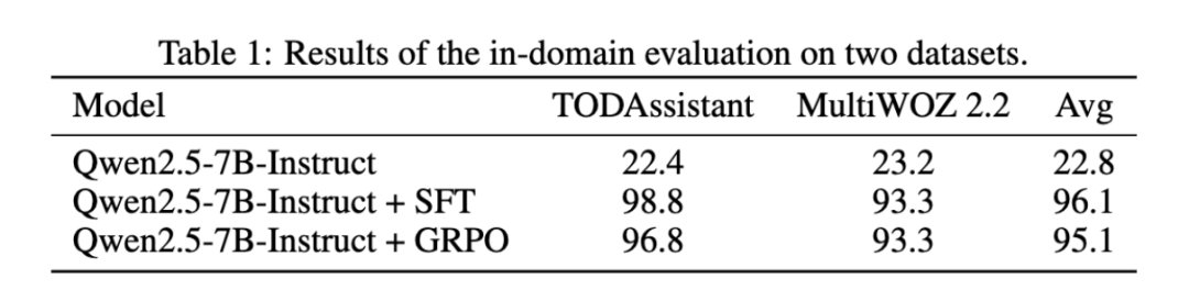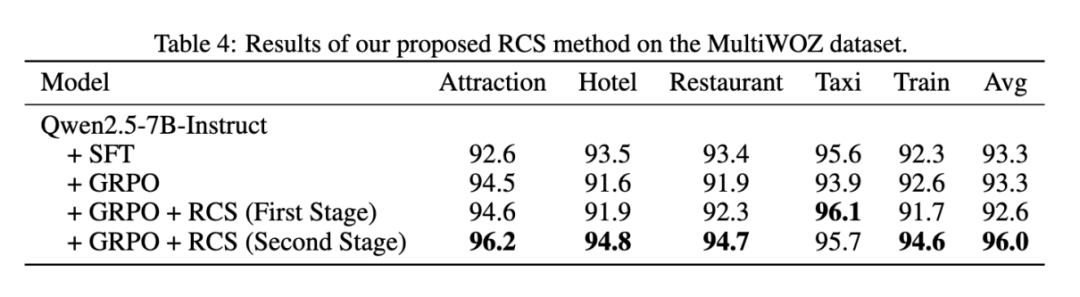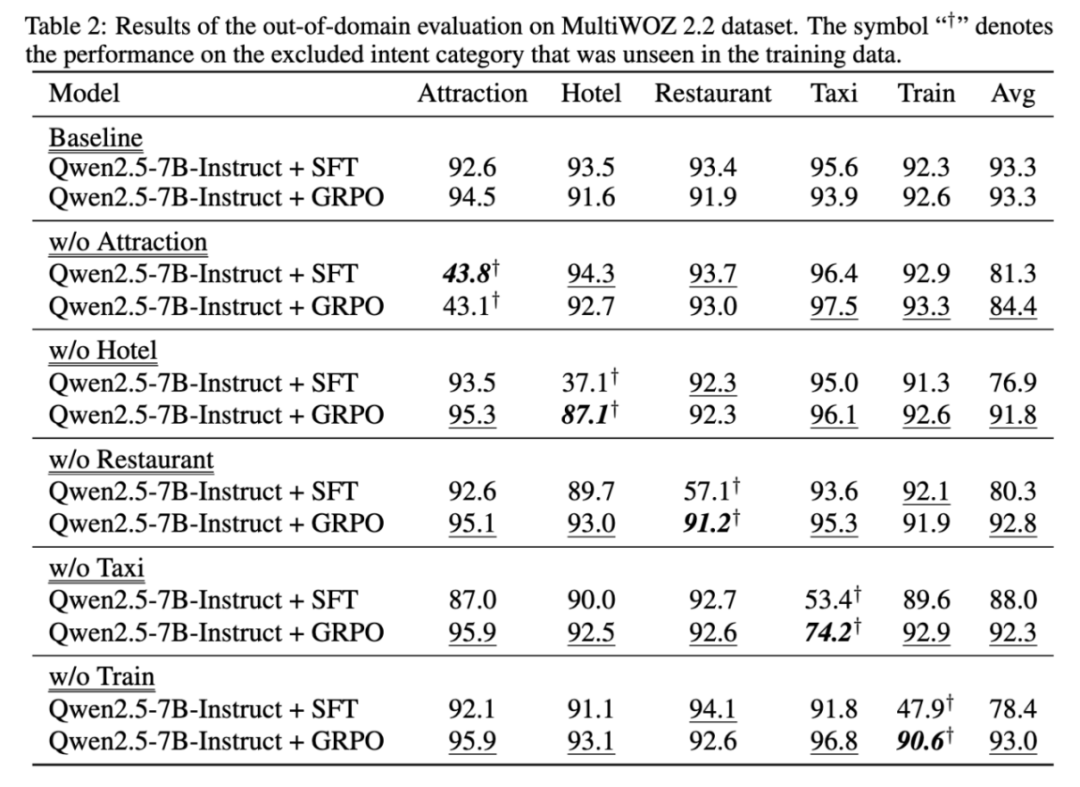 GRPO 方法与 SFT 方法的对比:研究团队首先对比了 SFT 方法和 GRPO 方法。直接使用原始的 GRPO 方法,在意图识别任务上,模型可以达到与 SFT 相近的性能,在英文的 MultiWOZ2.2 数据集上做到了与 SFT 模型相同的表现,证明了 GRPO 方法在该任务上的有效性。