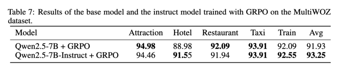Pretrain 模型和 Instruct 模型在该任务上的区别:研究团队发现,在意图识别任务上,选取 Pretrain 模型或者 Instruct 模型作为底座,在经过相同的 epoch 进行 GRPO 训练后,可以收敛到相近的性能,这与传统的训练经验有所不同。