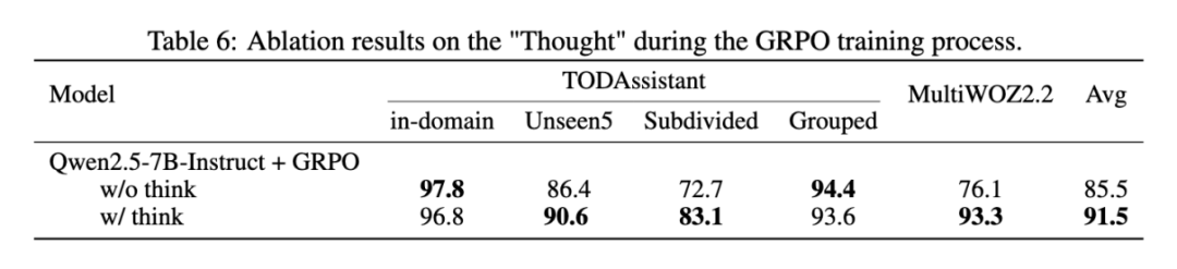 Thought 对于训练过程的影响:研究团队还探究了在意图识别这种逻辑较为简单的任务上 Thought 对于结果的影响。该团队发现,在这类任务上 Thought 同样有着关键的作用:在 TODAssistant 数据上,Thought 对于泛化能力的提升尤为重要;在 MultiWOZ2.2 数据集上,去掉 Thought 后模型的性能出现了大幅下降。