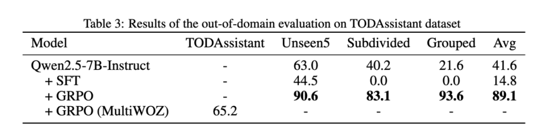 为了进一步探究 GRPO 的优势,研究团队针对模型的泛化性进行了评测。具体来说,在 MultiWOZ 数据集上,在训练过程中分别去掉测试集中的每个类别;在 TODAssistant 数据集上对原有的类别进行组合和细分操作,获得新的类别,来验证模型在该新类别上的准确性;该团队还测试了模型的跨语言能力(在英文数据集上训练后的模型在中文测试集上的结果)。实验结果表明,GRPO 方法相较于 SFT 方法,有着更好的泛化性能。