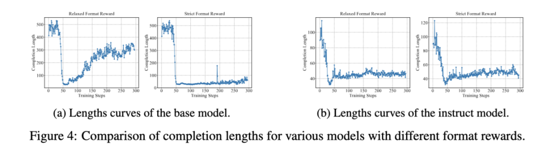 同时该团队还发现,instruct 模型在宽松格式和严格格式奖励函数下的生成长度均保持稳定。然而,Pretrain 模型在宽松格式奖励下生成长度先下降后上升,而严格格式奖励下则无此趋势。值得注意的是,这种长度增加并未提供有效信息。这一对比表明,类似 R1 的强化学习训练会诱导模型通过增加输出长度来获取更高奖励,但在相对简单的意图检测任务中,真正的 「顿悟时刻」 难以出现。