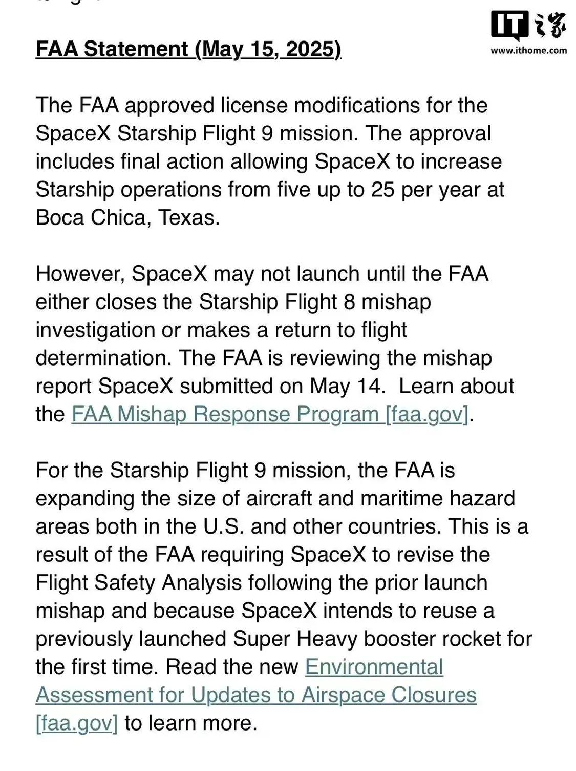 FAA 允许 SpaceX 在得州星际基地将每年发射次数上限从 5 次提升至 25 次,但 SpaceX 在 FAA 完成第八次试飞任务(IFT-8)事故调查或作出恢复飞行决定前不得实施发射。