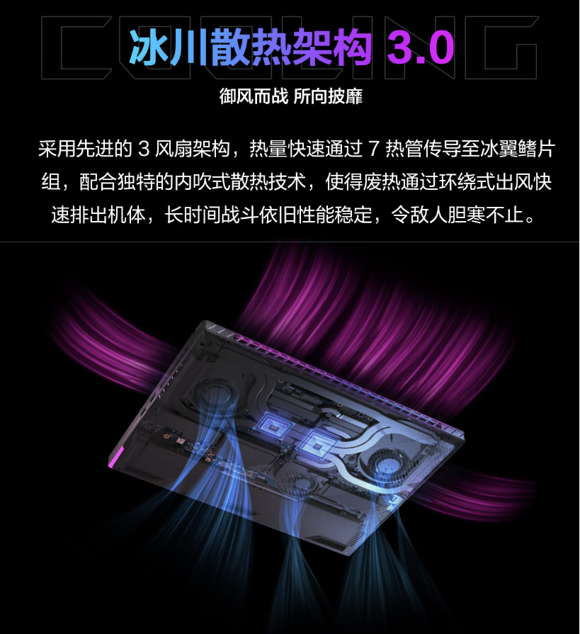 为了确保高性能输出时的稳定性,魔霸新锐锐龙版在散热系统方面采用了冰川散热架构3.0。这套散热系统拥有先进的3风扇设计,同时热量能够快速通过7热管传导到冰翼鳍片组上,配合独特的内吹式散热技术,令大量的热能快速排出机身,从而获得更加稳定的性能体验。