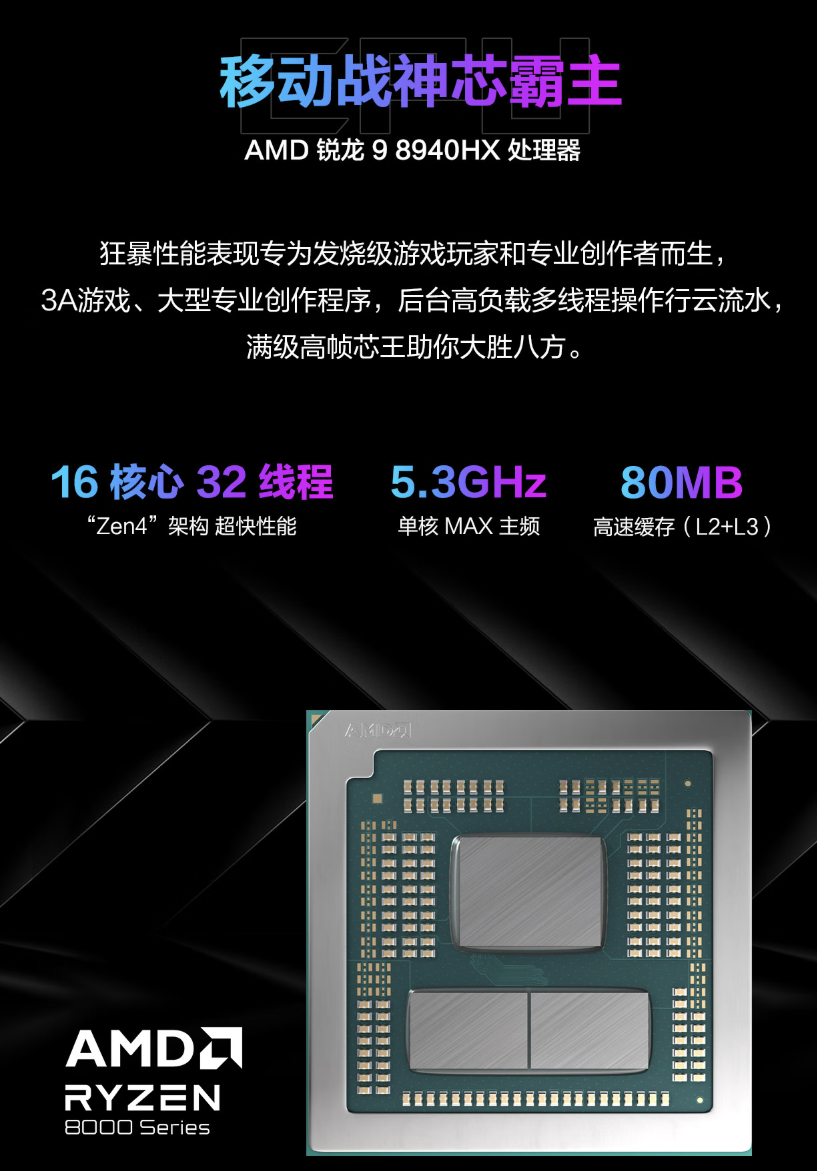 那么,全新一代魔霸新锐性能表现如何呢?处理器方面,该款产品使用了Zen4架构、5nm制程工艺打造的AMD锐龙9 8940HX处理器,拥有16核心32线程,集成80MB高速缓存,单核最大主频到达5.3Hz,性能实力过硬。