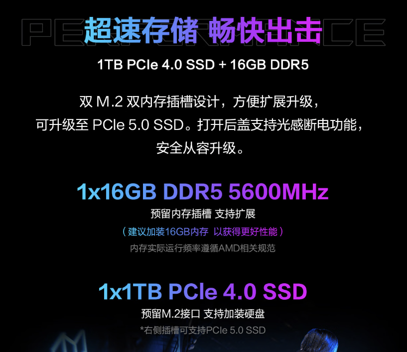 其他配置方面,支持16GB DDR5 5600MHz内存,并预留了内存扩展插槽。拥有1TB PCIe 4.0固态硬盘,同样预留了M.2接口,支持用户自行加装。