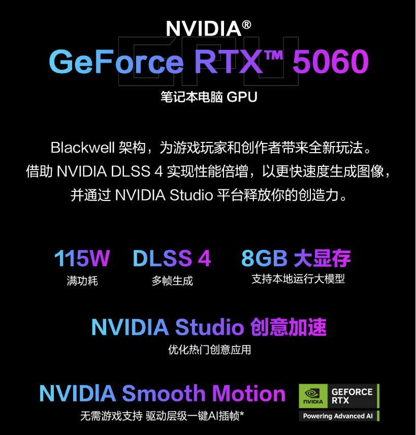 显卡方面,魔霸新锐锐龙版搭载了玩家们最受青睐的GeForce RTX 5060。该款显卡可实现115W满功耗释放,拥有8GB GDDR7大显存,不仅带来了出色的游戏性能,而且还支持本地运行大模型。此外,借助前沿的AI技术DLSS 4.0,使得这款游戏本能够实现逼真的图形效果和更加丝滑的游戏画面表现。