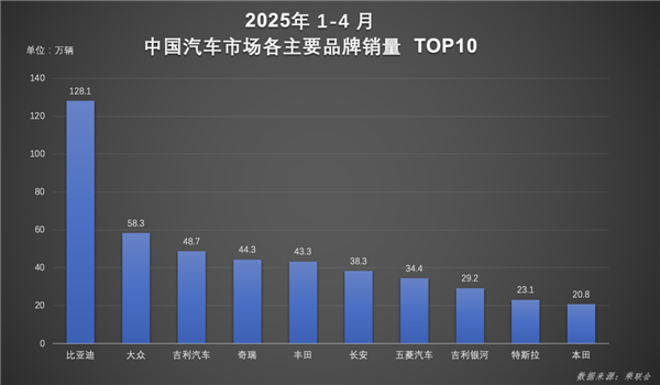 行业数据显示,比亚迪4月销量为34.7万辆,为中国全品牌第一,并且断层式领先其它品牌。