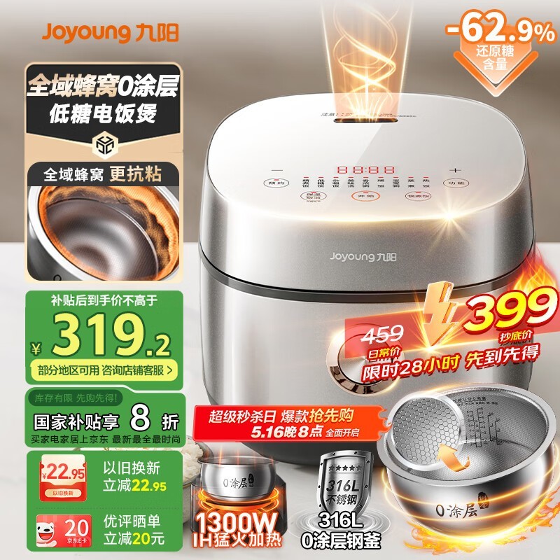 九阳4L低糖电饭煲京东热销,到手价439元