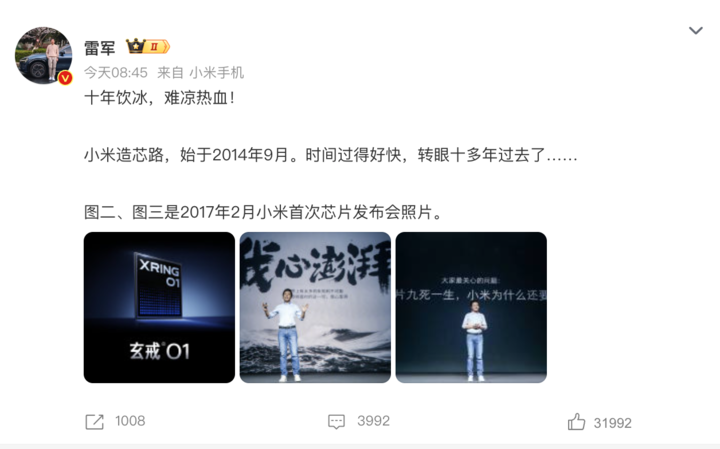 这是我们小米造芯 10 年阶段性的成果,也是小米突破硬核科技的新起点。造芯片是公众和米粉朋友们对我们殷切的期待,更是小米迈向硬核科技引领者的必由之路,我们小米将勇往直前。