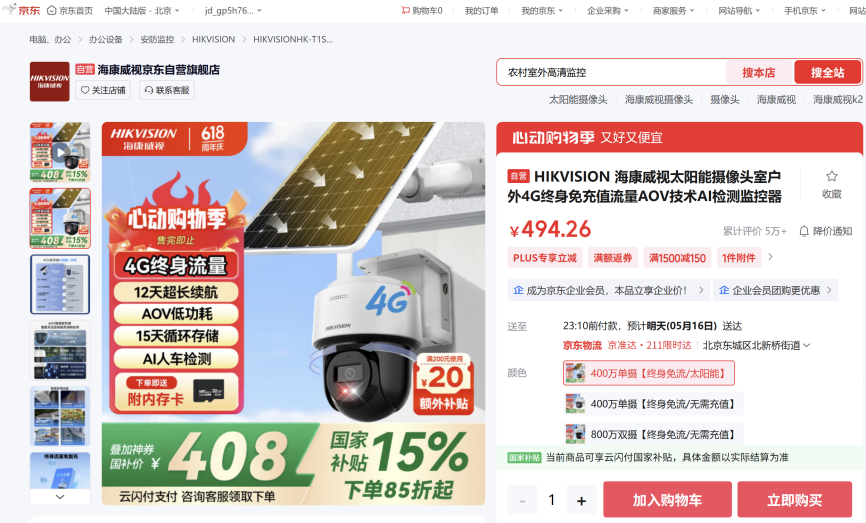 目前,海康威视新品太阳能AOV摄像头已在京东心动购物季先人一步抢先开售。传统的摄像头普遍存在布线复杂、流量费用高等缺点,在户外场景的使用效果尤其不佳,海康威视新款摄像头采用了太阳能板供电,并且终身免流量,是户外监控的全新优秀解决方案。其中400万像素单摄款在京东心动购物季下单可使用满200减20元的神券补贴,还能叠加国家补贴再减15%,最终到手价408元,企业用户下单可享98折专属优惠价。此外还有500万或800万像素、双摄或枪机等配置可选,同样有丰厚优惠福利。下面来看看新品摄像头具体有哪些亮点吧。