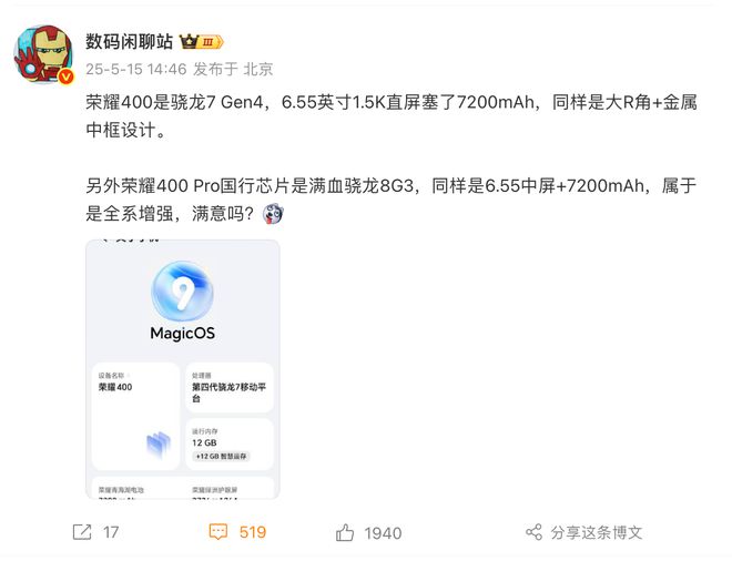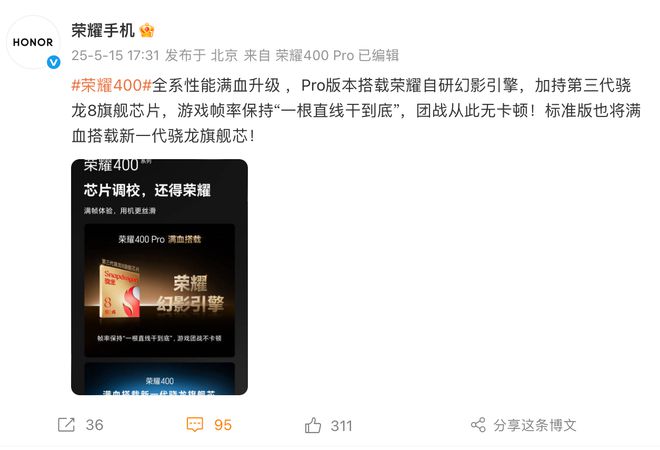 5 月 15 日晚间,高通正式发布了全新第四代骁龙 7(骁龙 7 Gen4)移动平台,荣耀 400 将首发搭载。此前,荣耀官方也宣布:荣耀 400 Pro 将搭载定制满血版 8 Gen3 平台。
