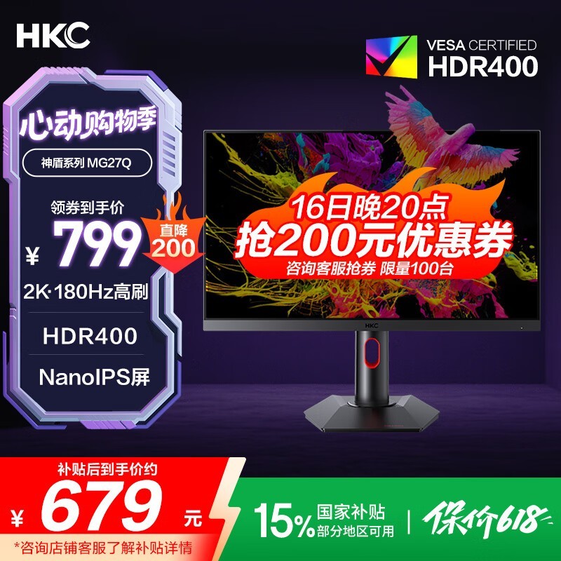 HKC神盾MG27Q显示器促销,原价865元到手674元
