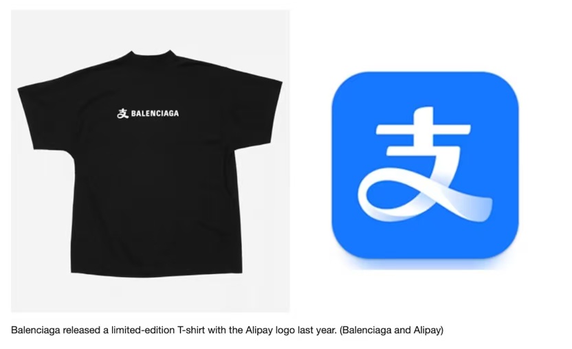 去年,巴黎世家在上海举办2025春季系列发布秀,在秀场展示了与支付宝跨界合作的联名款T恤,并在其天猫旗舰店、官网、限定线下门店以及微信小程序限量发售。