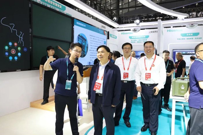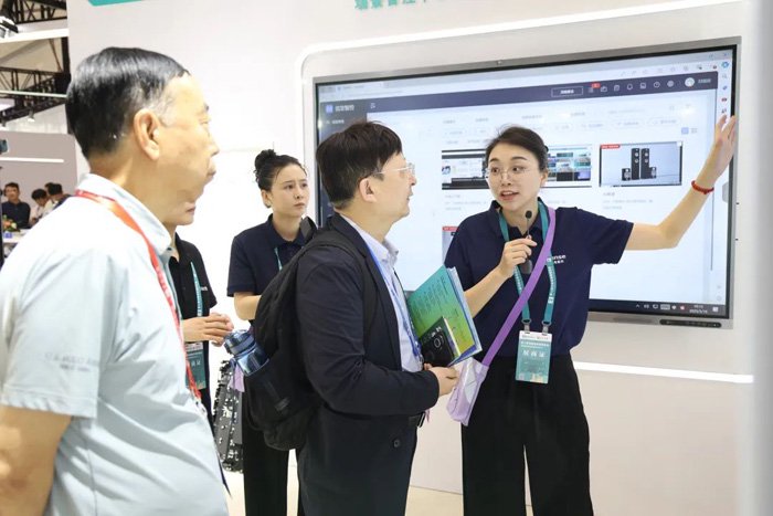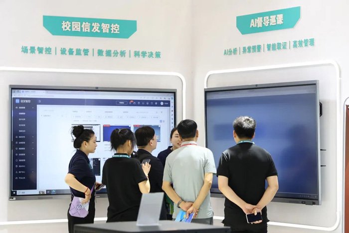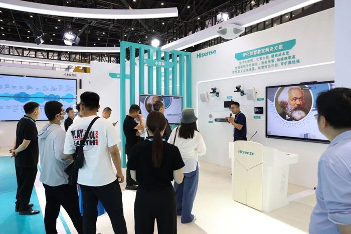 展会现场,海信触控产品新品MR5F-PRO系列亮相,打造AR教室、校园楼栋信息发布、AI督导巡课、校园信息智控发布等场景,展示新时代智慧校园图景。