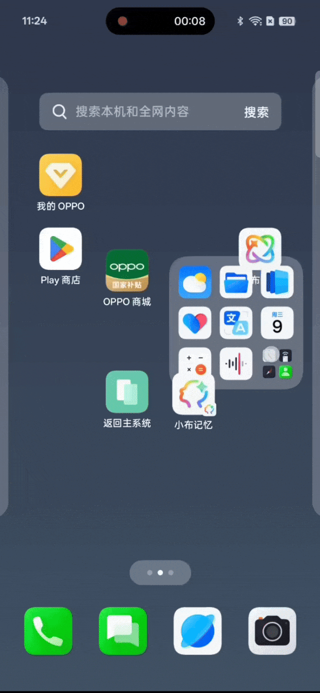 ColorOS 15带来了大文件夹自由变形动效,连贯且跟手,即使在应用布满桌面的情况下,也能随心拖动。当我们要把不同的使用频率APP归入文件夹时,可以拖拽文件夹,调节成大矩形、单个图标大小的小矩形,以及长条形(横、竖均可)共计四种形态,让常用的APP单独展示在外。
