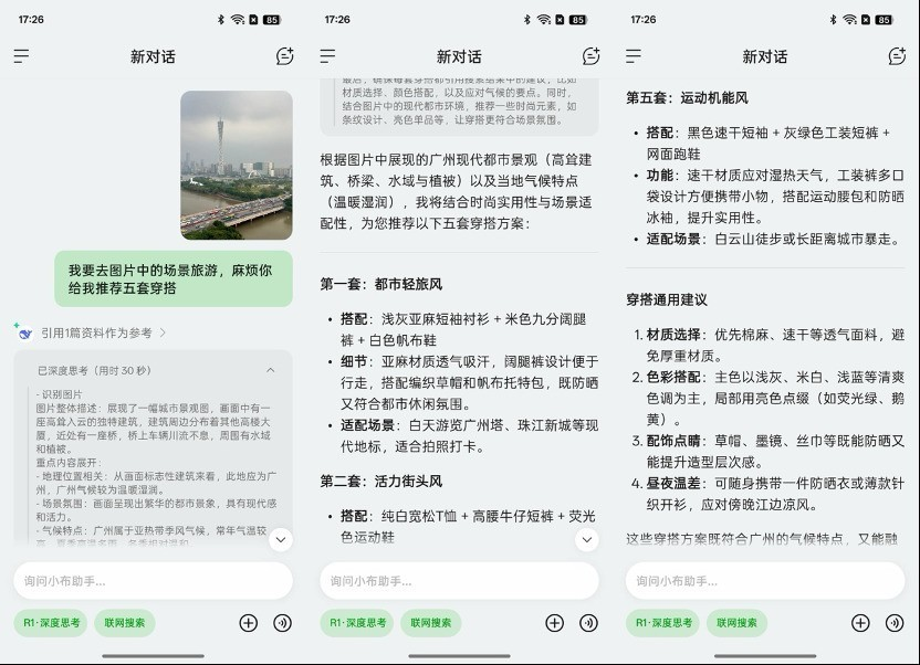 早在2月,小布助手就接入了这款强大模型,而这次系统更新后,新增的"联网识图"功能让AI助手变得更懂用户需求。当用户拍摄一张广州街景照片并询问旅行穿搭建议时,系统不仅能识别图片中的建筑特征和天气情况,还能通过网络搜索实时获取当地流行趋势,给出包含防晒外套搭配雪纺裙等五套具体方案。这种将视觉识别与互联网数据结合的能力,在同类产品中并不多见。