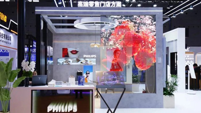 飞利浦商显通过打造特定场景的屏显解决方案,构建沉浸式购物空间,助力零售行业体验价值的变革。飞利浦“重磅产品”全息透明屏打破虚实的边界,创造震撼视觉效果的同时,提升门店的科技感和艺术感。其采用超80%透明度面板与悬浮影像技术,实现商品3D动态展示。例如珠宝门店中,钻石切割工艺可立体呈现,消费者无需触碰实物即可感知细节。