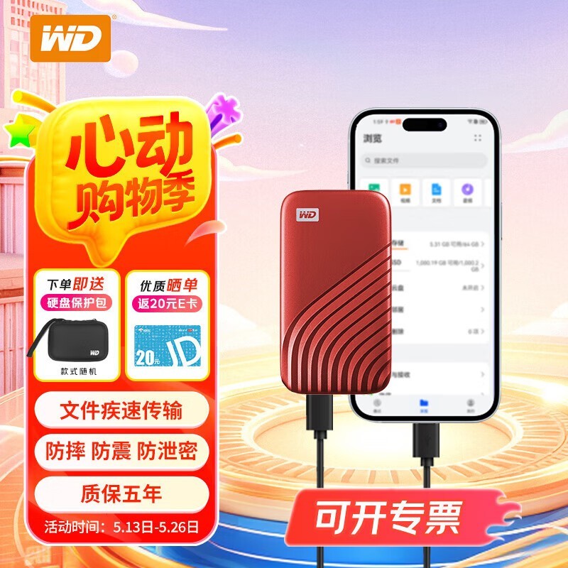 西部数据My Passport随行SSD 2TB星火红优惠价1039元