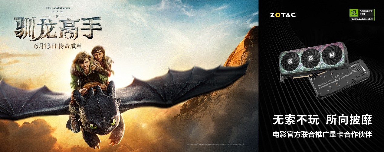 索泰秉承着“突破极限”的技术创新和“追求卓越”的产品理念,长期致力于为全球玩家和专业用户带来全新的游戏、创作及AI体验。本次索泰与《新·驯龙高手》进行联合推广合作,特别推出索泰GeForceRTX 50 XGAMINGBLACK系列,以出众的外观、别致的“五彩斑斓黑”设计、强劲的性能,与小嗝嗝和没牙仔并肩作战的英勇之姿相呼应,释放内心的力量,翱翔天际!