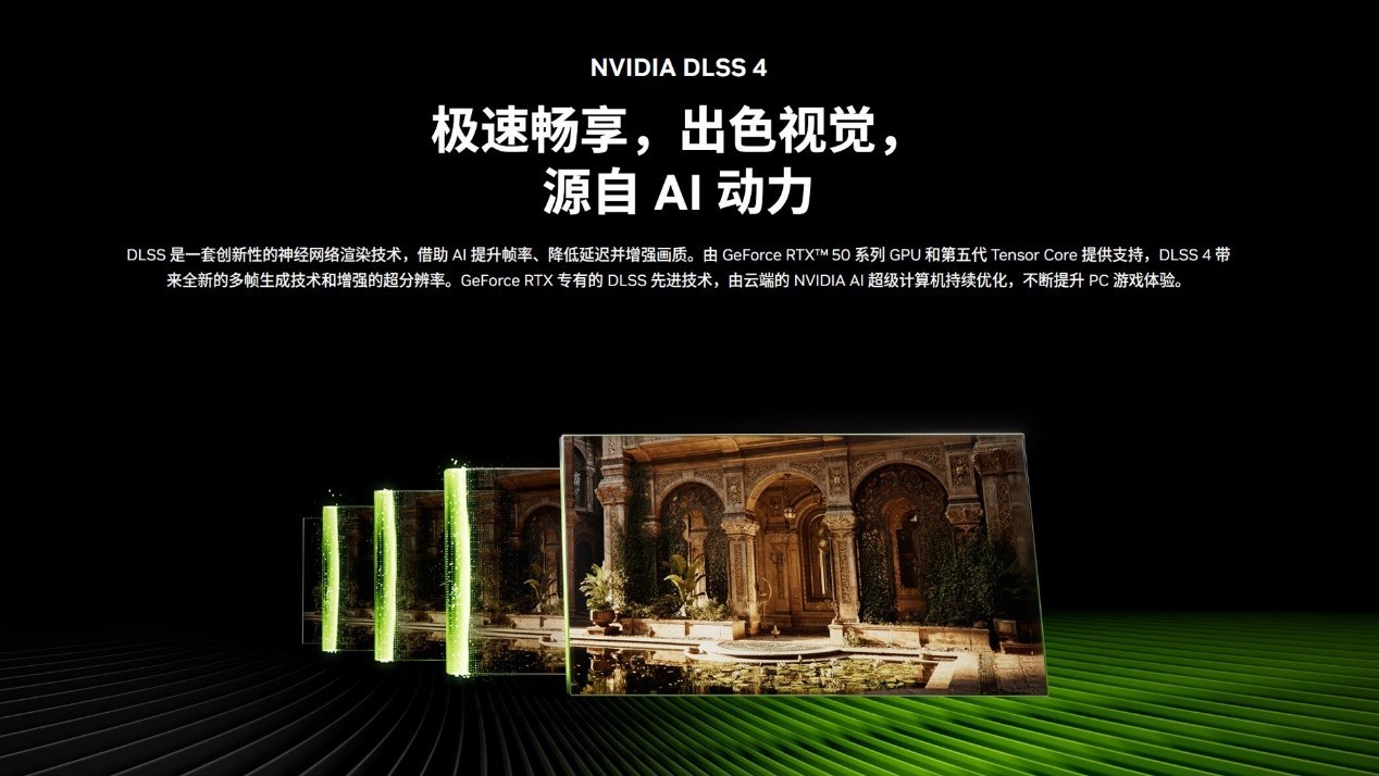 索泰GeForceRTX 50系显卡同样能为玩家和创作者们带来逼真的视觉体验。搭载全新Blackwell架构GPU,配备第四代RTCore和第五代TensorCore,使游戏中的光影效果更接近真实;全新的DLSS多帧生成功能由GeForceRTX 50系列和第五代TensorCore 提供支持,利用AI可为每个渲染帧额外生成最多3帧,从而进一步提升FPS。