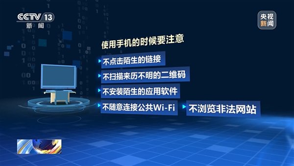 央视提醒:使用手机时,注意不点击陌生链接、不扫描不明二维码等,发现危害国家安全的行为及可疑线索,及时拨打12339举报。