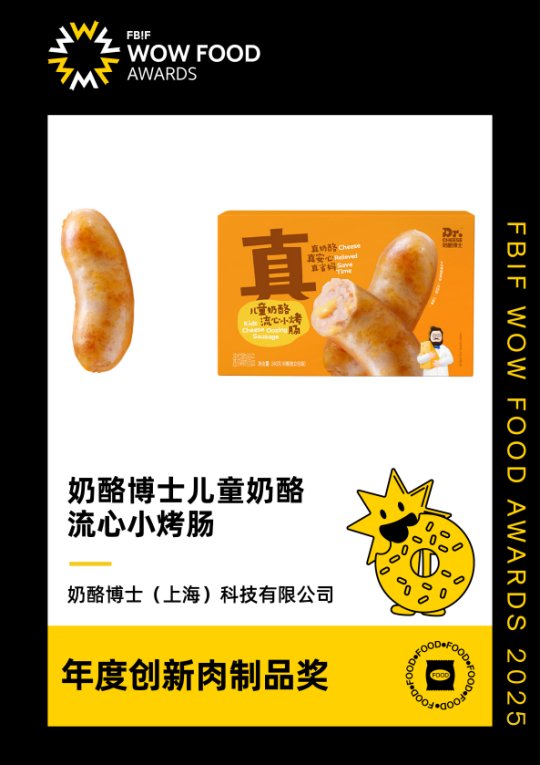 近日,食品界备受瞩目的“奥斯卡”——FBIF Wow食品创新奖2025(Wow Food 2025)颁奖典礼在上海国家会展中心盛大启幕。在全球300余个团队650组参赛作品的激烈角逐中,奶酪博士凭借儿童奶酪流心小烤肠与白金营养奶酪棒(双护配方)两大明星产品脱颖而出,分别斩获产品创新赛道“年度创新肉制品”和“年度乳粉及其他乳制品”两项大奖。