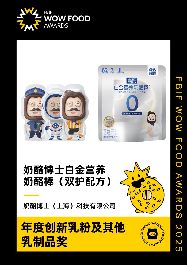 FBIF Wow 食品创新奖作为食品行业极具影响力和权威性的奖项,一直致力于表彰具有创新性、市场潜力和商业价值的食品产品。该奖项的评选过程严格,由业内专家、学者及资深从业者组成的评审团,从产品的口感、包装、配方、质地、原料等多维度进行综合考量,确保获奖产品兼具市场价值、消费需求和创新突破。奶酪博士此次双奖加冕,印证了其在儿童食品领域的创新实力。