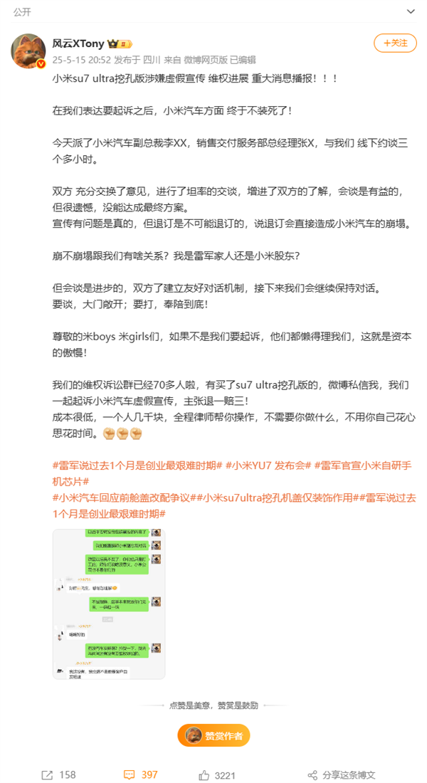 快科技5月16日消息,今日小米汽车副总裁李肖爽的传闻引发巨大关注,来源是博主“风云XTony”发文:小米汽车副总裁李XX在线下约谈时表示,退订会直接造成小米汽车的崩塌。