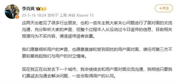 这两天出差见了很多行业朋友,也和一些车主就大家关心问题进行了面对面的交流沟通,充分聆听大家的声音,但整个过程本人从没说过今日谣传的信息,目前相关报道均为不实内容,请造谣传谣者自重。