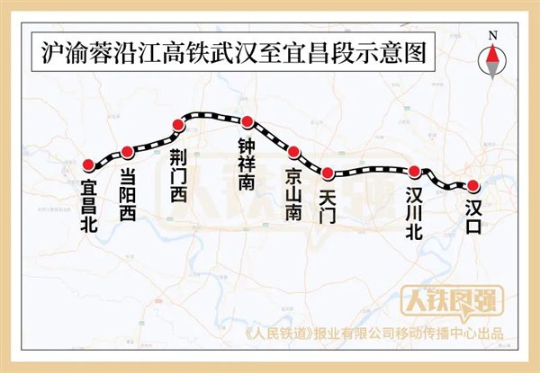 全线共设8座车站,其中汉口站为既有站,汉川北、天门、京山南、钟祥南、荆门西、当阳西、宜昌北等7座车站为新建车站,其中荆门西站部分工程为配合荆荆高铁开通已于2024年底投用。