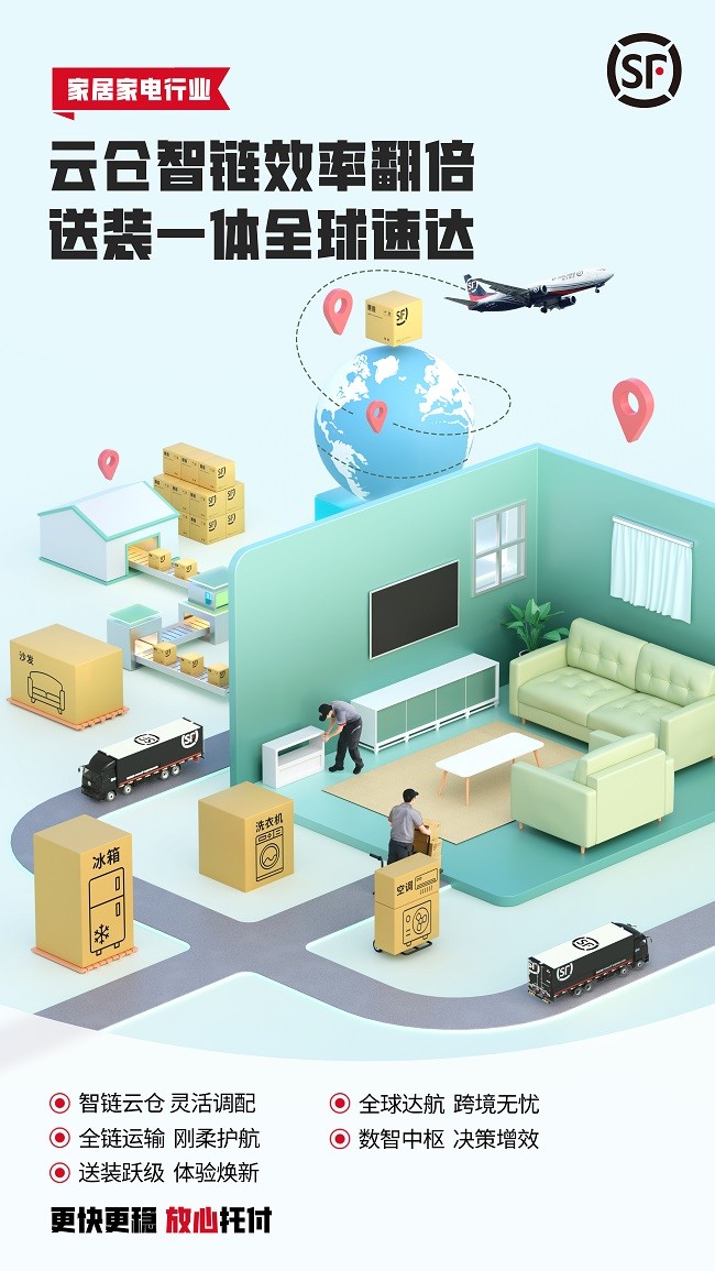 家居家电产品因体积大、重量重且需专业安装,一直是电商物流的难点。为此,顺丰拥有专业派送安装团队来确保消费者购买大件家电家具时能够享受专业送装一体服务;针对家居家电经销商旺季备货存在资金短缺困扰,顺丰推出以行业需求为导向的产业链科技金融方案;在出口贸易方面,顺丰构建了跨境陆海空铁运、清关、海外仓及本地运输一体化服务体系。