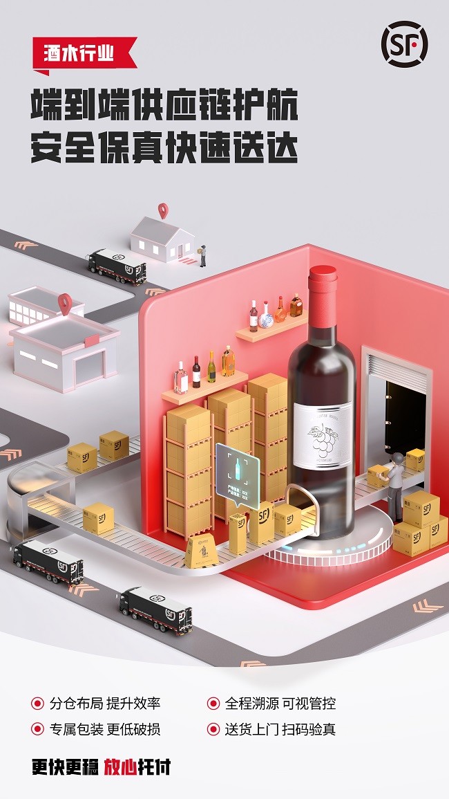 酒水行业则存在着经销商库存积压、流动资金紧张,以及自建物流成本高、不能专注于销售等痛点。顺丰通过自有金融服务能力,并与各大银行合作,助力经销商缓解资金压力、加速商品流通。